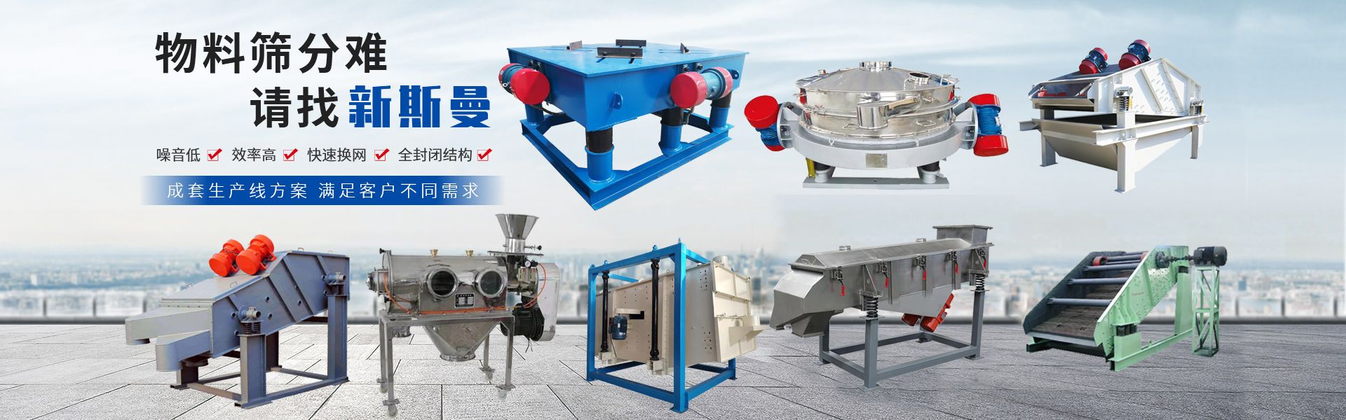 • 公司致力于研發定制各種標準及非標篩分設備及配套生產線,主要產品有XSM系列三次元振動篩分過濾機、旋振篩、直線振動篩、超聲波振動篩、礦用振動篩、圓振動篩、直排篩、標準檢驗篩(藥典篩)、搖擺篩、氣流篩、氣旋篩、過濾篩、拍擊式標準振篩機、振動電機、螺旋輸送機、垂直提升機、振動給料機、振動平臺、高頻振動平臺、倉壁振動器等等。